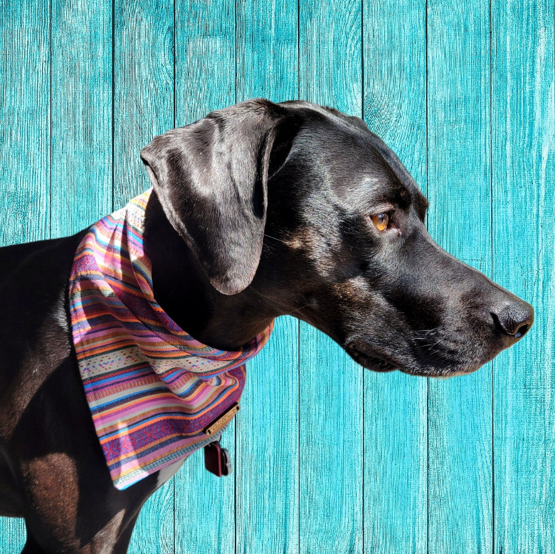 One of our best selling patterns now in a bandana! This woven bandana features bright pops of pink, blue, orange, purple and white. Sewn to be a single layer thick with snap closure it's perfect for summer or all year round.