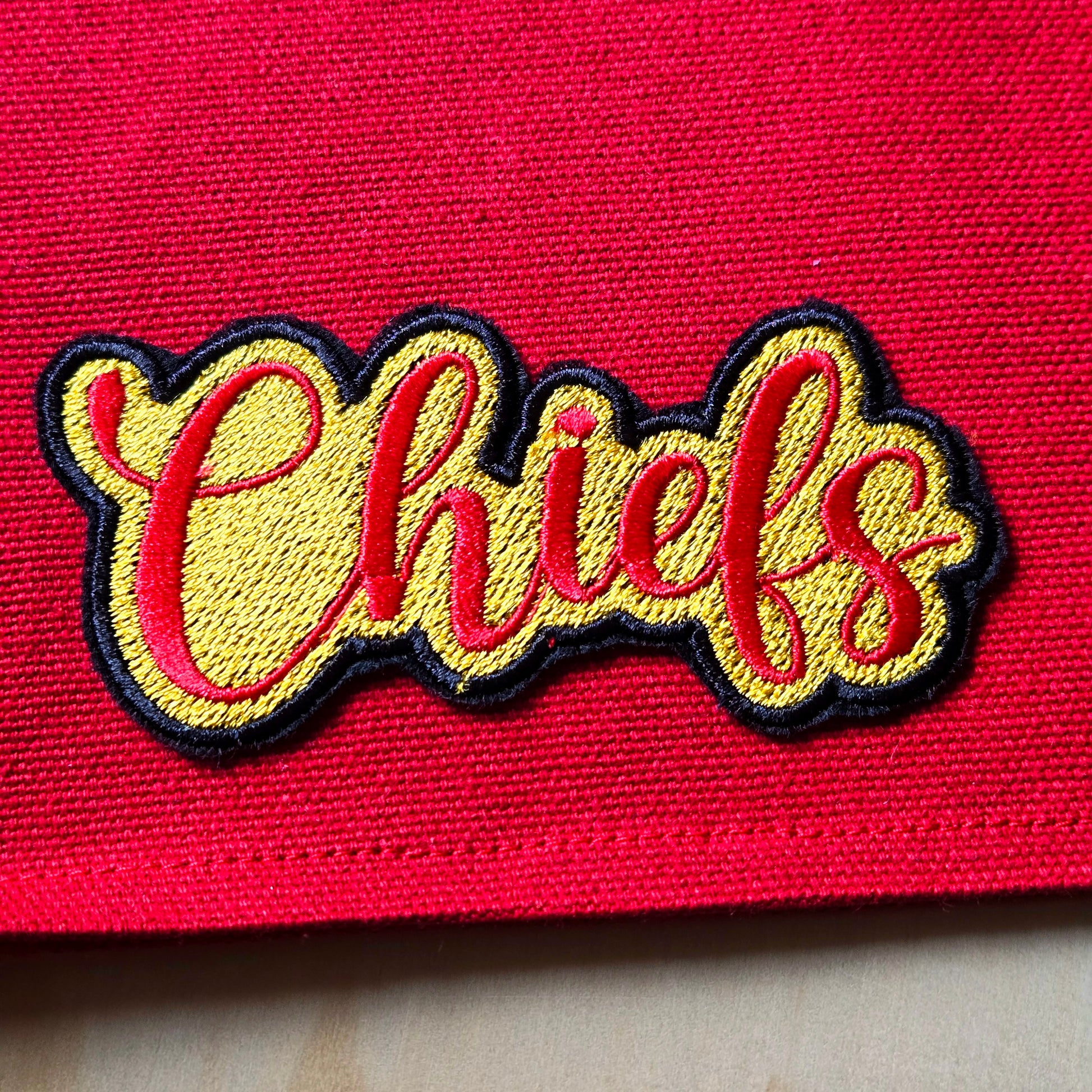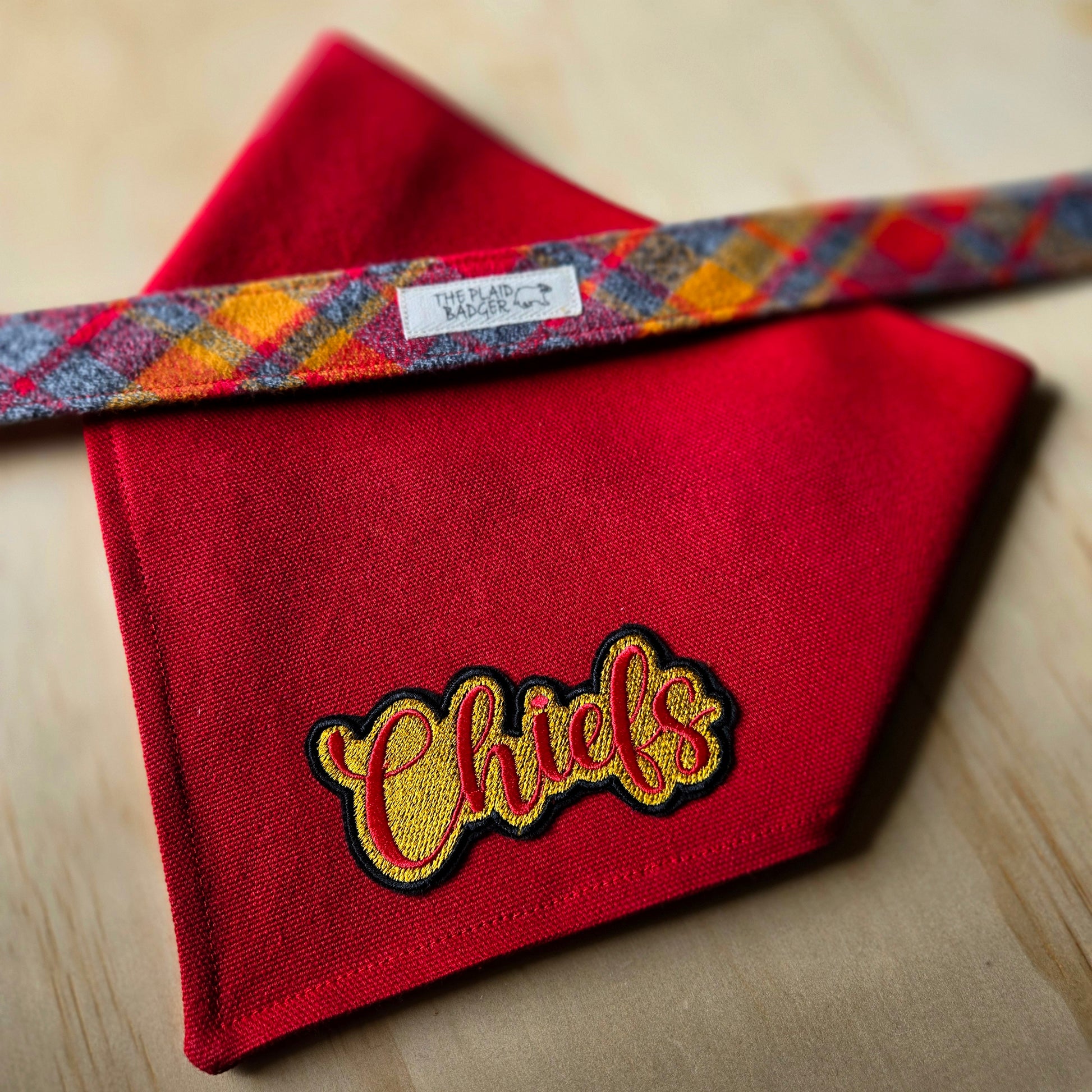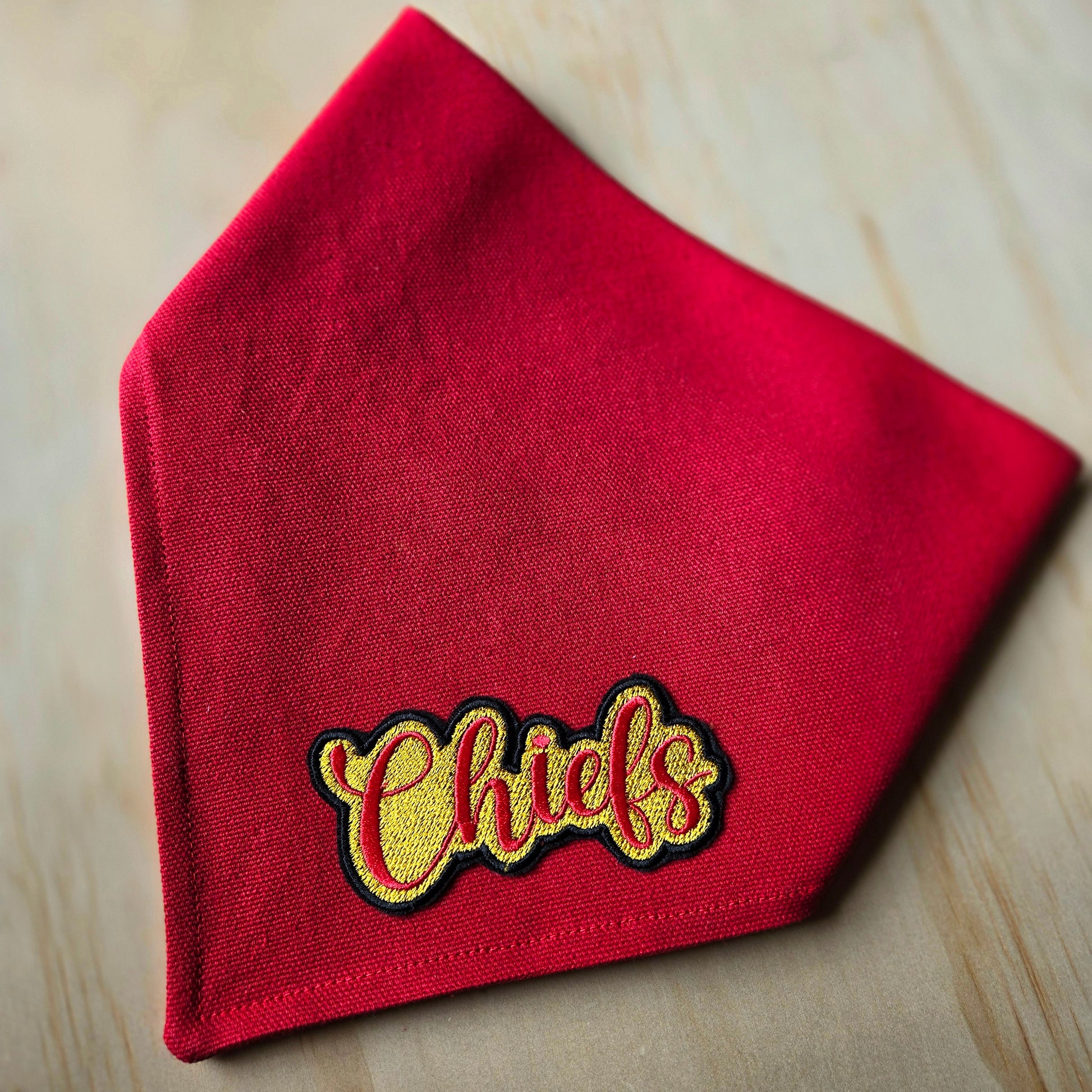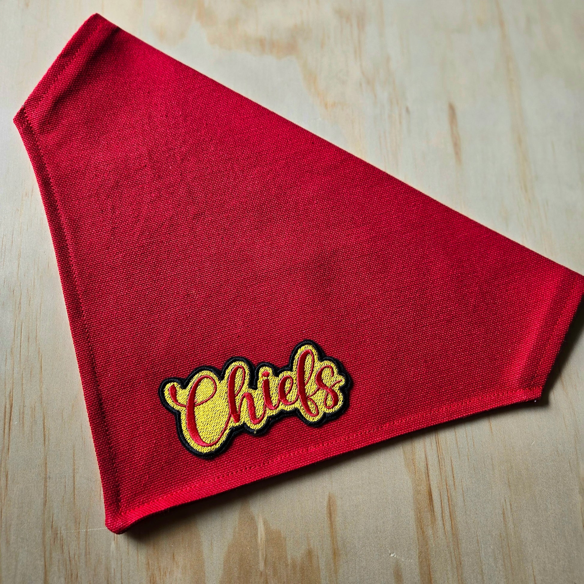 This over the collar bandana is perfect for any Kansas City Chiefs fan! Made with durable red cotton canvas featuring a handmade iron-on Chiefs patch. Patch measures approximately 1.75" tall by 3.5" long.