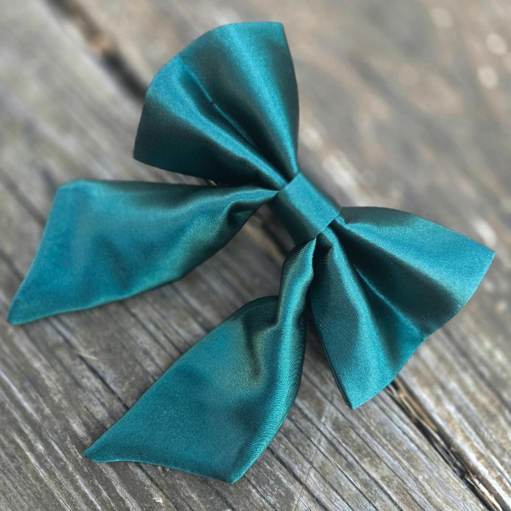 Sleek satin bow tie in striking holiday hunter green. Simply thread your dog's collar through the elastics on the backside of the bow and they're ready to go.