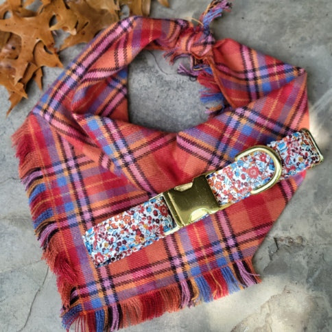 With lovely shades of red, burnt orange, and pops of sky blue this collar is made from high-end, satiny soft Liberty of London floral fabric. It features a pretty vintage-looking floral pattern that's perfect for fall, or everyday!