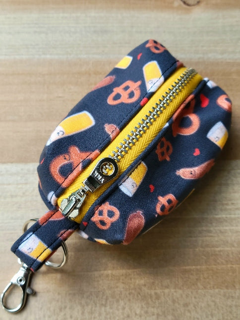 This waste bag holder features hearts, and happy beers, pretzels and sausages on a black background.