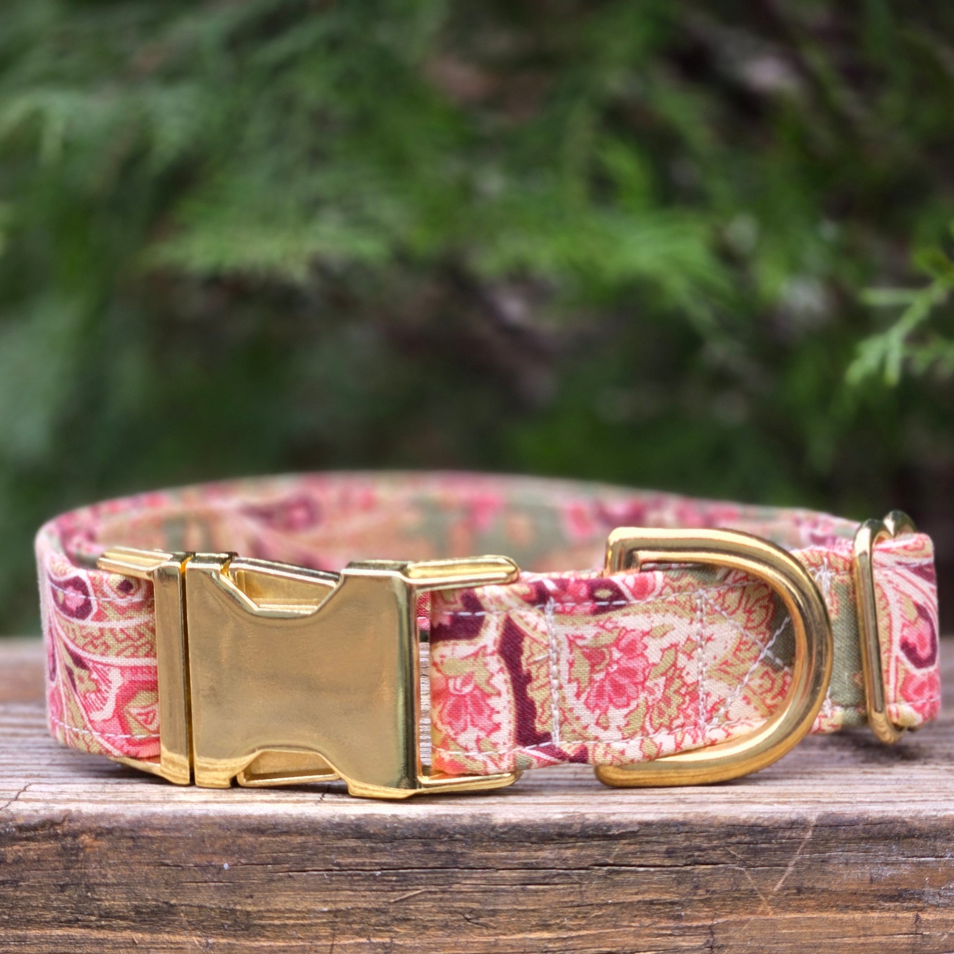 Your pup deserves a collar as unique as their personality! This Sage and Pink Paisley Dog Collar brings retro flair to every walk and adventure. Crafted from vintage cotton, it showcases a beautiful paisley design in calming sage, deep burgundy, and blush pink hues that'll have everyone asking where you found such a gem. The timeless pattern pairs comfort with character, making it the perfect choice for dogs with serious style credentials. Watch your furry friend rock this charming accessory with confidence!