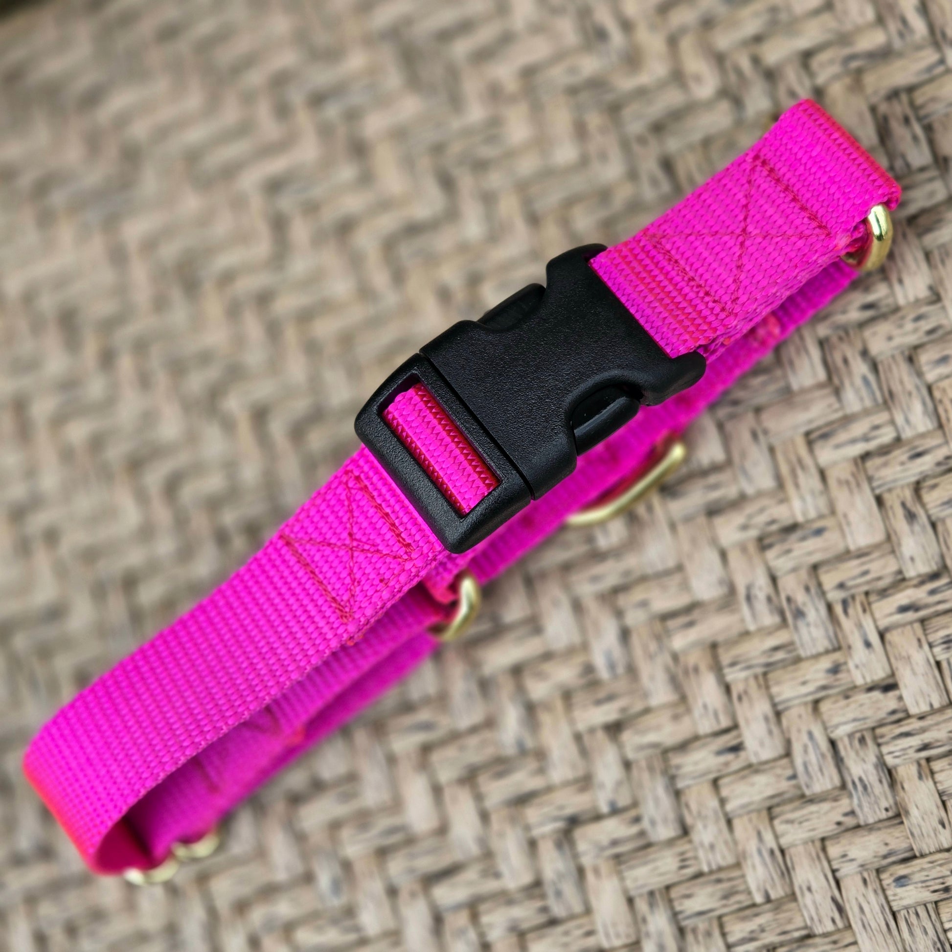 With fun bright colors, these martingale collars are made durable for the pups that need a little extra cinch. Extra thick nylon webbing in your choice of color and hardware finish. Collars come with a standard hard black plastic buckle.