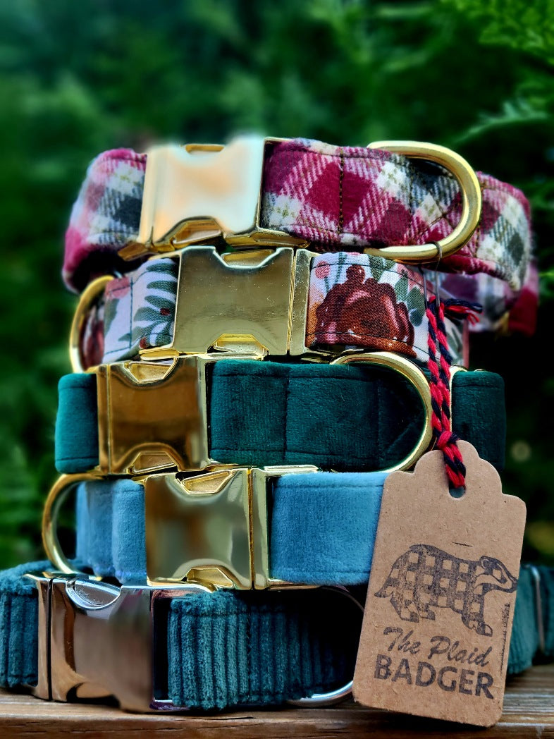 I source everything: the fabric, the hardware, and other needed components. I create most of our items as small batch--limiting the quantity of fabric I'll purchase. I love a good vintage fabric find, and mixing and matching patterns for an elevated, and thoughtfully curated look. You can buy a dog collar anywhere, but with a Plaid Badger item, I want you to feel the love and joy put into your item, and know that it's superior quality, special, and never mass-produced.