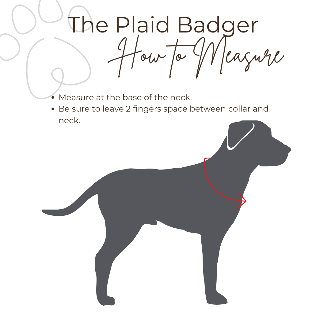Use a soft measuring tape or length of string, gently wrap around your dog's neck (make sure you’re measuring the thickest area). Tape/String should be snug, but with enough space that you can fit two fingers between it and your dog's neck for a little wiggle-room. Do not pull the string too tight that it stretches!