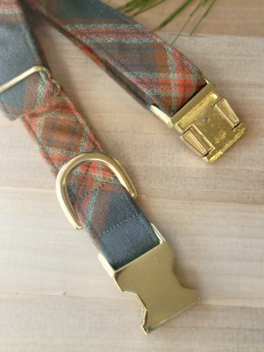 With high contrast, this plaid is so stunning. It features shades of ochre, orange, and seaform on a of a grayish green blue background. This collar is snuggle-soft made with 100% medium weight cotton flannel.