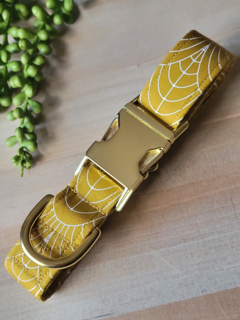 Mustard yellow with striking white lines that have an art deco vibe. I meticulously arrange the fabric on every item for the best appearance allowing this pattern to truly shine.
