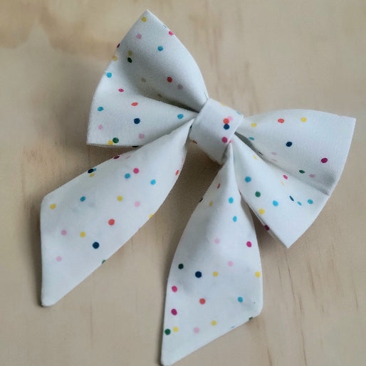 Cue the confetti! Perfect for any birthday celebration, this cotton fancy bow features multi color bright rainbow polka dots.