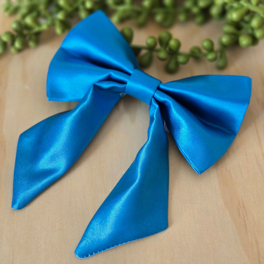 Sleek satin fancy dog bow in striking bright blue. Simply thread your dog's collar through the elastics on the backside of the bow and they're ready to go.