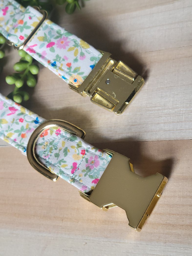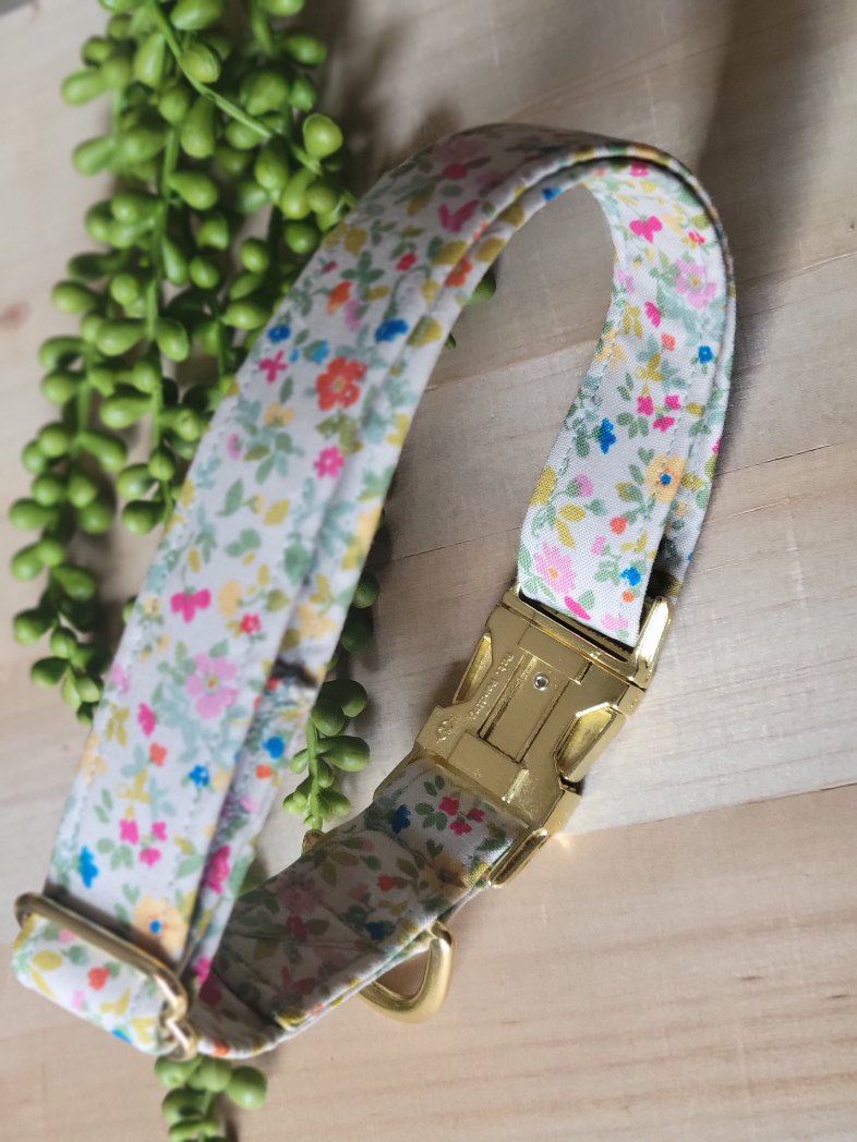 Pretty blooms and warm days ahead, this collar is sure to please. It features bright pops of blue, pink, yellow, orange, and sage green on a dark ivory background. Made with lightweight cotton fabric, this collar is as strong as it is pretty.