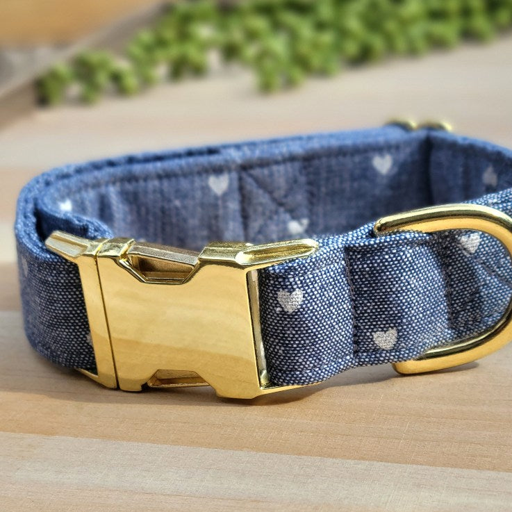 Made from designer denim, the Chambray Hearts Set features a medium blue denim with small printed white hearts!