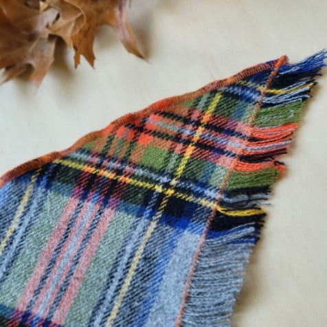Autumnal shades of moss green, royal blue, yellow, black and orange on a medium gray backgound, this medium weight bandana has been lightly frayed and is ready for cozy nights by the fire!