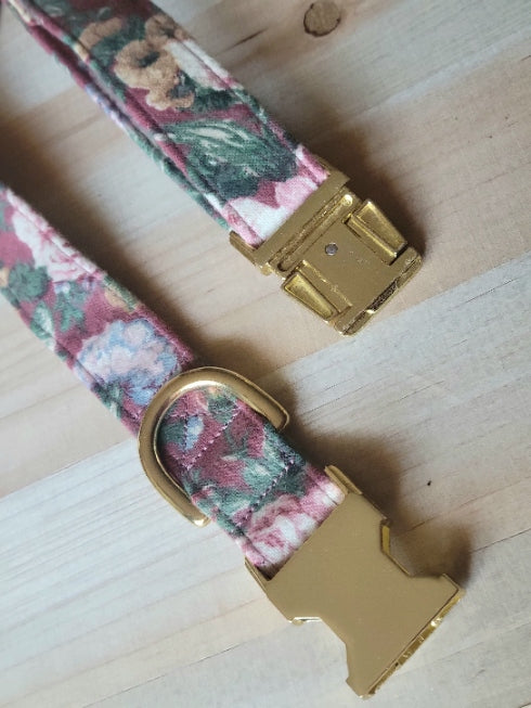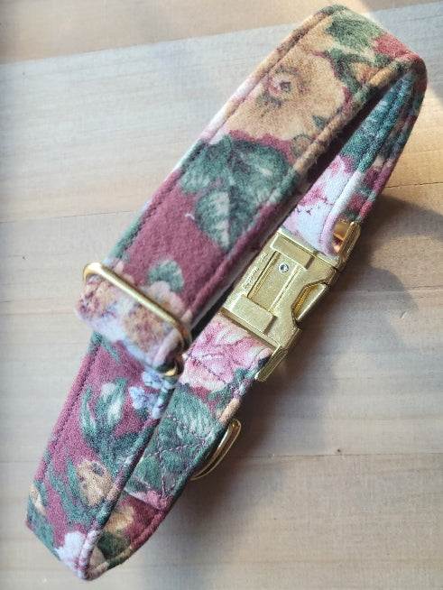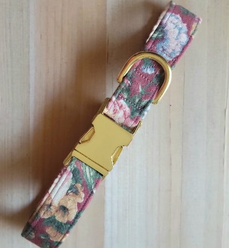 Gorgeous dog collar made from vintage cotton flannel. Lovely dusty pastel flowers in multi colors on mauve background.