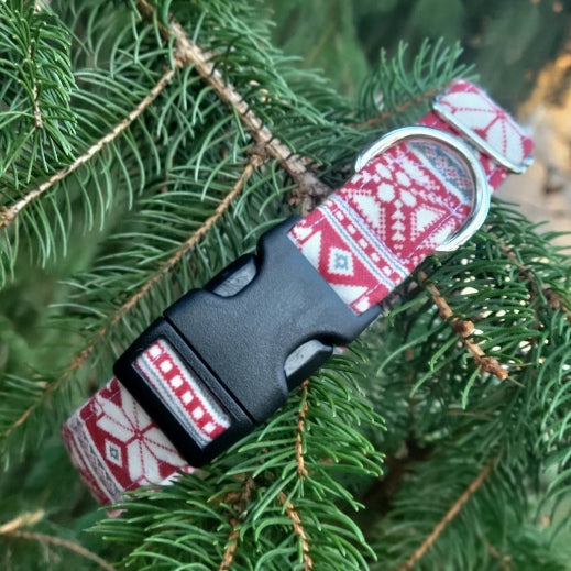 Perfect for the holidays or all season long! This collar features pretty snowflake type patterns in a fair isle style fabric collar. Pops of white and dark gray on a muted red background. This is a lightweight cotton flannel fabric.