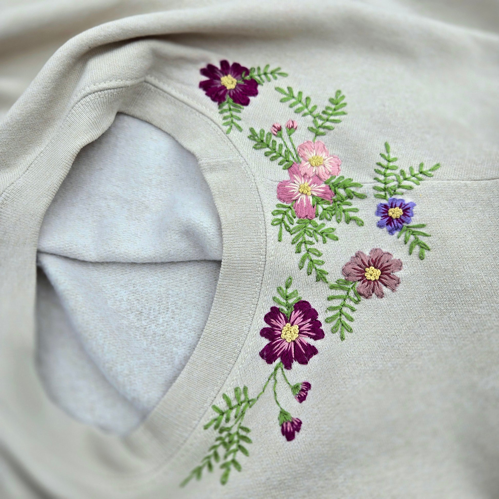 Pretty and delicate, hand embroidered flowers and greenery. Each sweatshirt is uniquely hand drawn and hand embroidered for a special, one of a kind look!