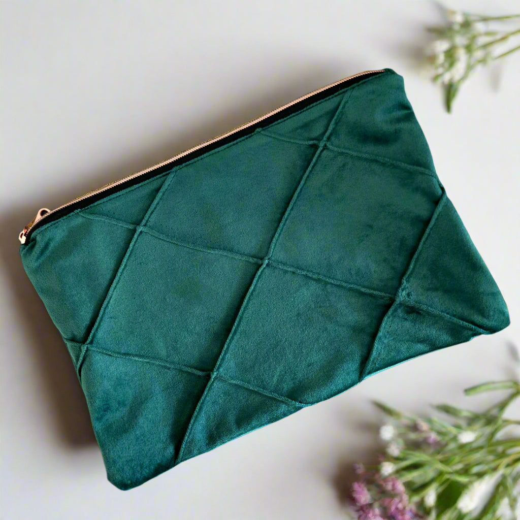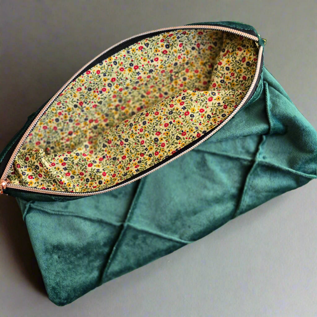 Dark hunter green velvet clutch with quilted outside. Inside lining features pretty delicate flowers with inside pocket. Rose gold zipper.