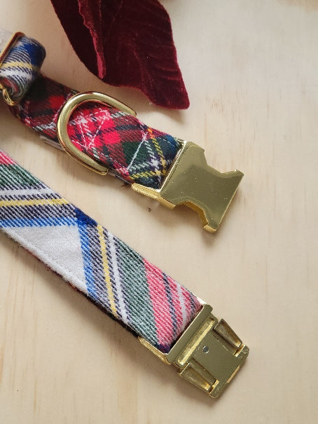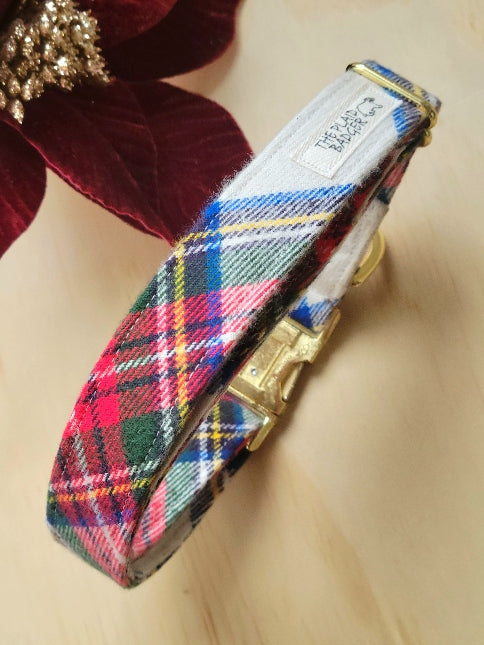 Perfect for the holidays, this beautiful collar is made with 100% medium weight cotton flannel in a traditional Christmas plaid pattern featuring bright pops of red, blue, green and yellow on an ivory background.