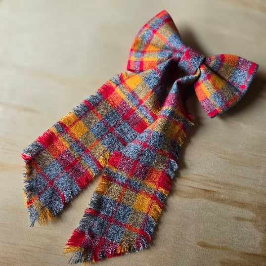 Celebrate your Chiefs' pride with this oh so soft and cozy, hair bow--for you! Purposely selected to coordinate with the hometown team, the Kansas City Chiefs, it features shades of red, gray, and gold in tighter packed plaid pattern. Barrette on the back makes for easy wear. Tail has been lightly frayed in the classic Plaid Badger style!