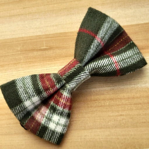 With logs crackling on the fire nothing's better than a cozy Christmas. Muted tones of dark moss green, burgundy, white, light green, and yellow in a medium weight soft cotton flannel bow tie.