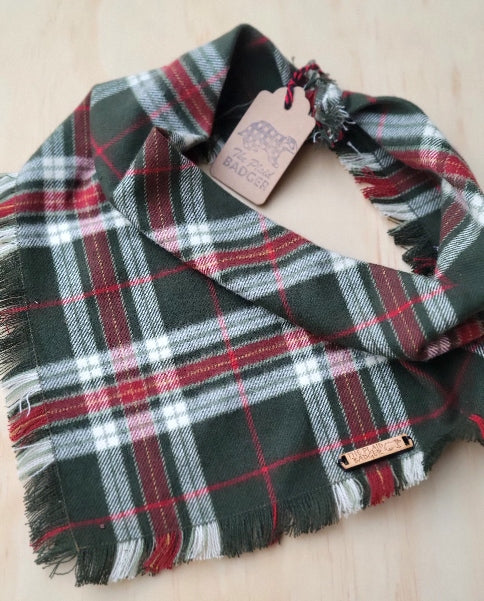 With logs crackling on the fire nothing's better than a cozy Christmas. Muted tones of dark moss green, burgundy, white, light green, and yellow in a medium weight soft cotton flannel bandana. One of our top sellers!