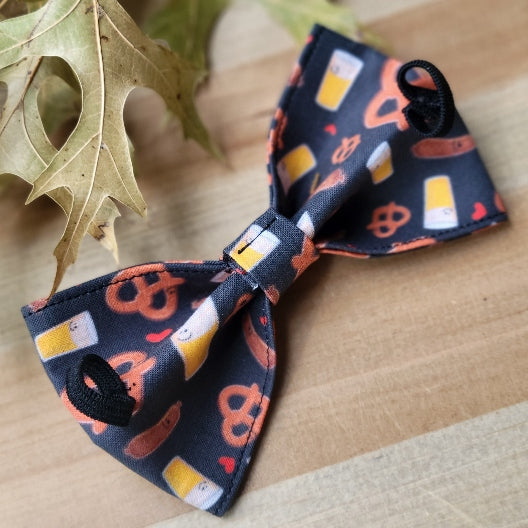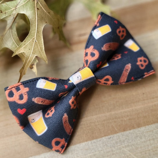 Let's kick off fall and Oktoberfest in style. Hoist a stein of your favorite beverage and cheers your fur baby in this adorable Oktoberfest themed dog bow tie. With hearts, and happy beers, pretzels and sausages on a black background you'll be saying prost in no time!