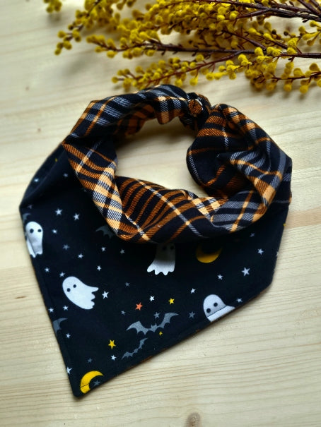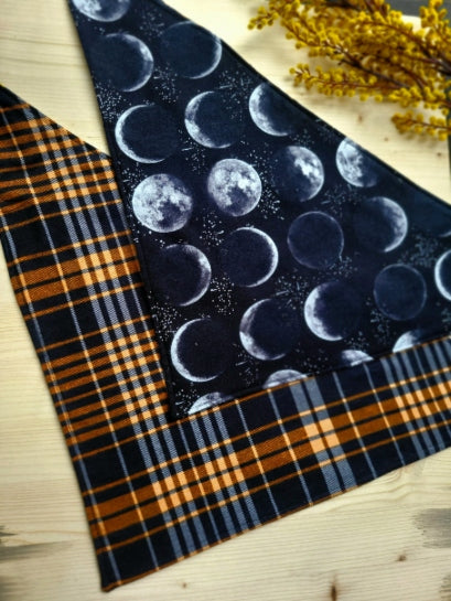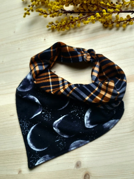 Because two looks are better than one! These Halloween dog bandanas are perfect for your boooo-gie dog. Choose between our moon phase bandana or our spooky ghost bandana. Both are made with cozy soft cotton flannel and reverse to a cute and complementary black and orange plaid flannel. Wear one side one day, or switch up the look, and roll the back side down over the front to show both patterns at once (our personal favorite!)