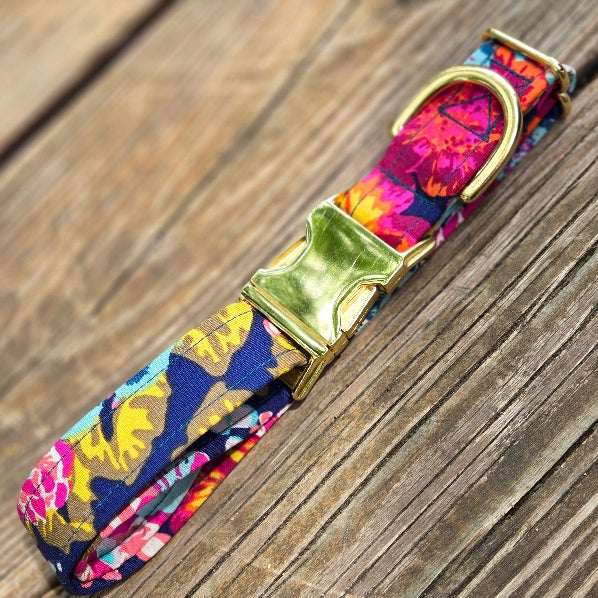 One of our best sellers! With bright pops of fuchsia, teal, orange, yellow, and more, on a bold navy background this collar is a customer favorite and perfect for summer-- or all year-round!