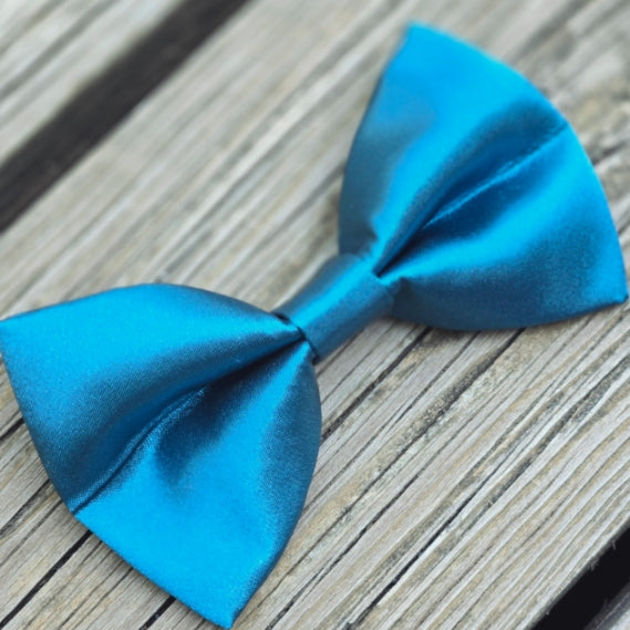 Sleek satin bow tie in striking teal. Simply thread your dog's collar through the elastics on the backside of the bow and they're ready to go.