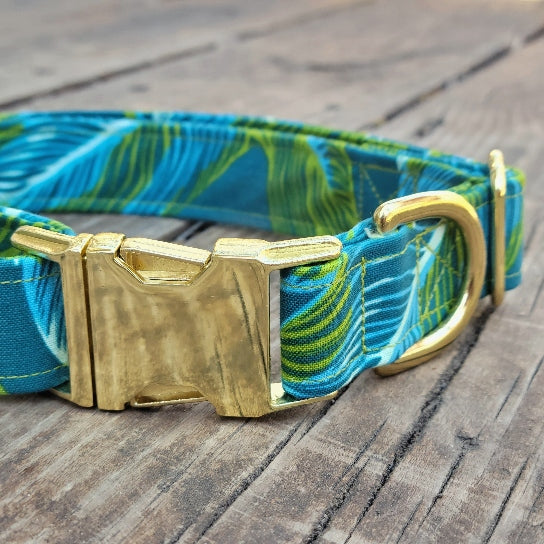 Tropical leaves adorn this collar in bright shades of lime and bright blue on a teal background.