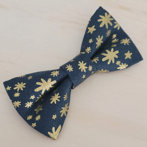 Kick off the holiday season in style with this beautiful dog bow tie featuring metallic gold stars on a very dark green background. Elegant and yet perfect for every day.