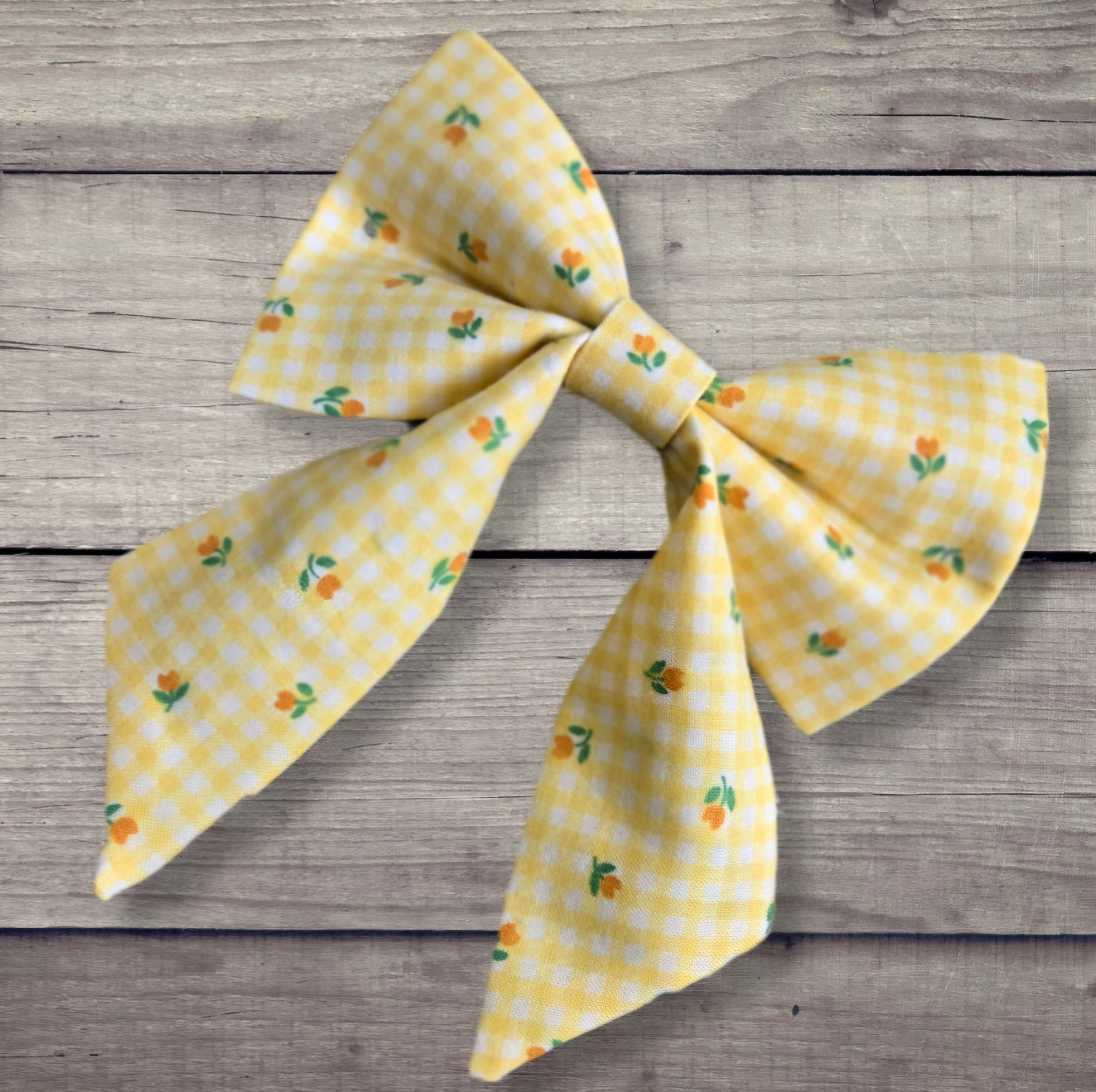 Our classic bow tie with a feminine touch! Yellow tulips on a yellow and white pastel gingham background. Perfect for spring or all season long!
