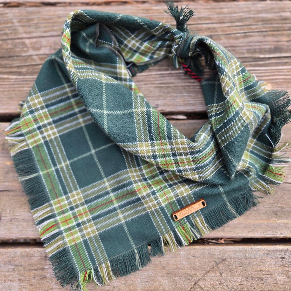 With logs crackling on the fire nothing's better than a cozy Christmas. With shades of moss green, white, and red on a beautiful medium green background, in a medium weight soft cotton flannel bandana your pup will be cute and festive all season long!
